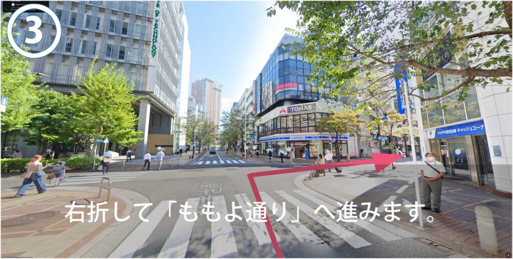 右折してももよ通りを進むと正面に赤レンガの「山楽ビル」が見えます。