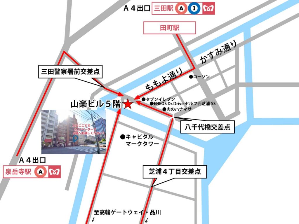 田町駅から徒歩10分、三田駅から徒歩13分です。